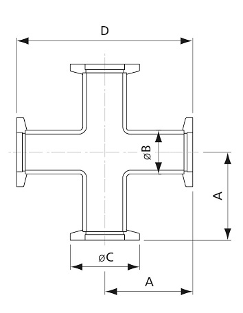 These KF 4-way cross vacuum fittings follow KF standards. They are commonly used to build foreline vacuum plumbing and process systems. They are often called quick flange fittings because they are quick to assemble. A circumferential clamp and centering ring form the vacuum seal between the connecting flanges. The centering ring contains a rubber elastomer o-ring. The standard sizes for quick flange fittings are KF-10, KF-16, KF-25, KF-40, and KF-50. They are made of corrosive-resistant stainless steel.